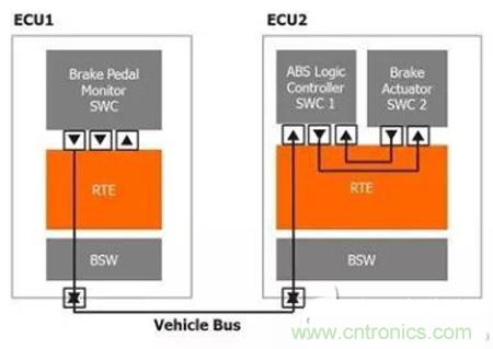 將設計與硬件決策分開使車輛生產商/OEM能夠依據所需的車輛功能進行自上而下的設計。存在于這個設計時間的虛擬功能總線(VFB)概念讓所有軟件電子控制單元都能夠實現互連和獲得測試。這讓設計人員可專注于應用層,而不是根本的軟件基礎建設。通過采用虛擬功能總線,應用軟件組件(SWC)與其它應用軟件組件也相互獨立。軟件組件向虛擬功能總線發出輸出信號,虛擬功能總線再將信息傳送給目標組件的輸入埠。AUTOSAR定義了輸入和輸出端口,以及交換信息的格式。這種抽離式的(abstracted)方法使得在定義相關硬件之前可實現所有車輛軟件功能和接口交互驗證。設計調整也因此變得容易得多,同時所有功能都被定義成虛擬功能總線上的軟件組件(圖2)。