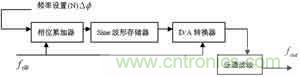 基本模型如圖1所示,主要由時鐘頻率源fclk、相位累加器、波形存儲器(ROM)、數(shù)/模轉換器(D/A)、以及低通濾波器(LPF)組成。輸出信號波形的頻率表達式為: