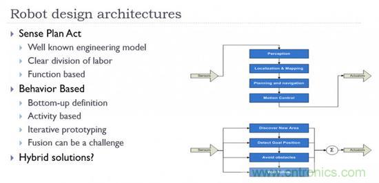 沒有萬靈的結構,混合系統結合了SPA和反應體系的原理,將多種混合系統應用于在傳感器和電機輸出間進行協調來完成任務。混合結構相結合最具吸引力的好處可能是:系統按照有利于完成任務的標準進行設計,而非刻板的遵循某一教條。但再復雜的機構,基本上也都是二者的組合。以ROS的導航包為例: