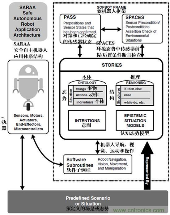 我們稱具有這種體系結構的機器人為SARAA機器人。當正確地實現時,這些編程技術產生一個基于知識的機器人控制器。因此,一個SARAA機器人是一個可以在預先設定的場景和態勢中自主行動的知識型機器人。其中一個設計思想是根據場景和態勢對前提/后置條件的判斷以提高安全性。