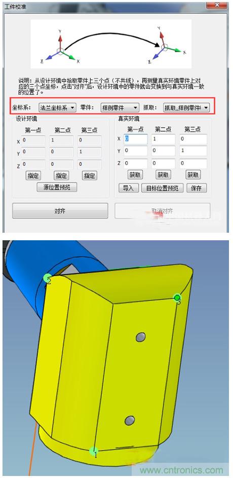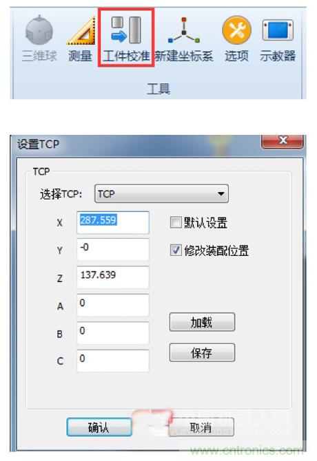 然后,我們對零件的三維模型進行工件校準以及對工具的TCP進行設置,完成此步驟后零件和工具的位置就已經和實際的位置保持一致了。
