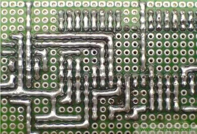 網上還流行一種方法叫錫接走線法,如下圖所示,工藝不錯,性能也穩定,但比較浪費錫。純粹的錫接走線難度較高,受到錫絲、個人焊接工藝等各方面的影響。如果先拉一根細銅絲,再隨著細銅絲進行拖焊,則簡單許多。洞洞板的焊接方法是很靈活的,因人而異,找到適合自己的方法即可。