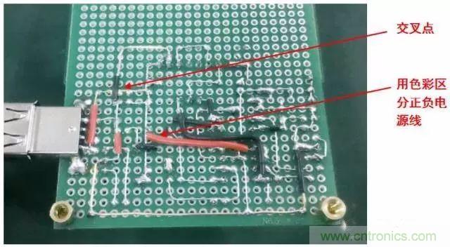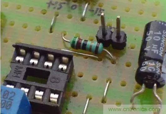洞洞板的焊接需要大量的跨接、跳線等,不要急于剪斷元器件多余的引腳,有時候直接跨接到周圍待連接的元器件引腳上會事半功倍。另外,本著節約材料的目的,可以把剪斷的元器件引腳收集起來作為跳線用材料。