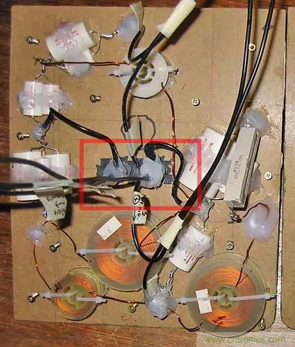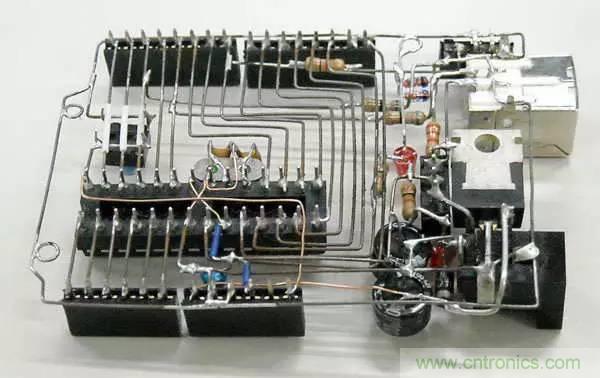 對于元器件在萬能板上的布局,大多數人習慣“順藤摸瓜”,就是以芯片等關鍵器件為中心,其他元器件見縫插針的方法。這種方法是邊焊接邊規劃,無序中體現著有序,效率較高。但由于初學者缺乏經驗,搭出來的板是這樣的……