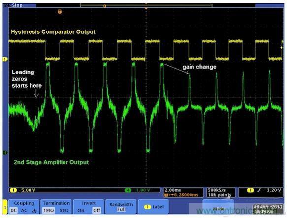 由于所有這些參數的影響,信號幅度可能在幾百個uV至幾十個mV之間變化。這個范圍可以用放大器進行補償。但不能用固定增益放大器。當劃卡速度很高,卡的質量又很好時,放大器輸出可以飽和到電源軌電壓。而當信號飽和時,用兩個連續峰值之間的時間差代表的信息將丟失。因此如實地放大傳感器信號、不至于使波形發生飽和或改變很重要。這就要求使用增益可配置的放大器,以便我們隨時調整增益。要做到這一點,系統必須能夠檢測信號變弱的時刻。這可以用跟蹤傳感器信號的ADC尋找近似的信號峰值來實現。
