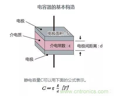 普通電容器由2枚電極(金屬板)和中間夾著的介電質(zhì)組成。一旦施加電壓,電子就聚集在一個電極上,是儲存電荷的狀態(tài)。此時(shí)電極間的介電質(zhì)通過「介電分極」現(xiàn)象,發(fā)揮增加靜電容量的作用。