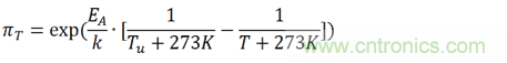 公式中,αf為測試的加速因子,也就是加速(后綴為a)測試條件下MTTF(Mean Time To Failures,平均無故障時間)與參考(后綴為u)測試條件下MTTF之比。EA是活化能,在0.79eV和0.95eV之間,k為玻爾茲曼常數。指數x為相對濕度的影響,指數y為電壓的影響,都是經驗數據,但是必須通過實際評估來確認。我們把此加速模型擴展到壽命預估模型中。