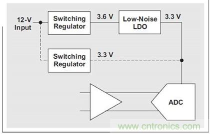極大降低系統功耗的一種方法是對高速數據轉換器的電源進行優化。數據轉換器 設計和工藝技術的一些最新進展,讓許多新型 ADC 可以直接由開關電源來驅 動,從而達到最大化功效的目的。 系統設計人員們習慣在開關穩壓器和 ADC 之間使用一些低噪、低壓降穩壓器 (LDO),以清除輸出噪聲和開關頻率諧波(請參見圖 1)。但是,這種干凈的電 源設計的代價是高功耗,因為 LDO 要求壓降余量來維持正常的運行。最低壓降 一般為 200 到 500mV,但在一些系統中其可以高達 1 到 2V(例如,ADC 的3.3-V 電壓軌產生自一個使用 LDO 的 5V 開關電源時)。
