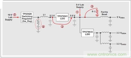 實驗 2—將一個 10-V 實驗室電源連接到 TPS5420 降壓穩壓器,其使用一個5.3-V 輸出。這樣可為 TPS79501 提供一個 300-mV 壓降,從而生成一個 5-V電壓軌。