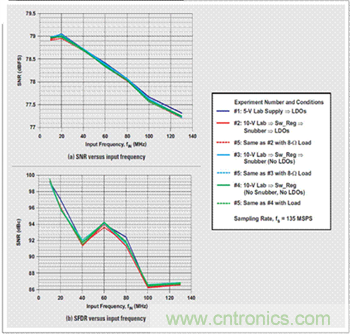 5 次實驗的結構變化配置如下: 實驗 1—一個 5-V 實驗室電源直接連接到 5-V 模擬輸入,同時繞過開關穩壓器(TPS5420) 和低噪聲 LDO (TPS79501)。使用一個板上 LDO(TI 的 TPS79633)生成 ADS5483 低敏感度 3.3-V 模擬及數字電源的 3.3-V 電壓軌。