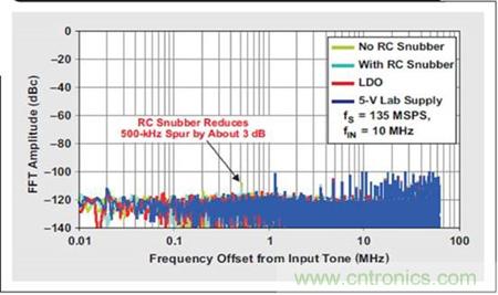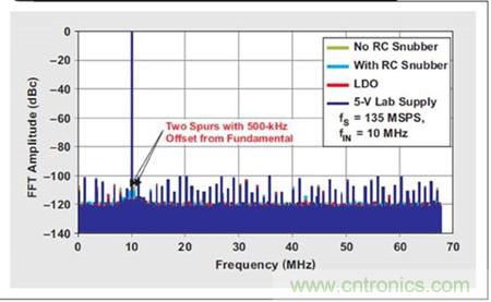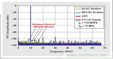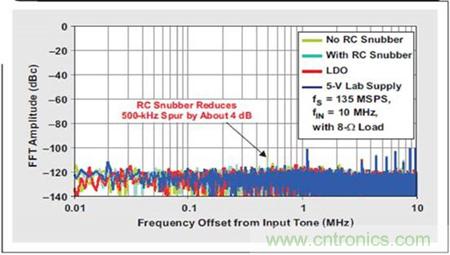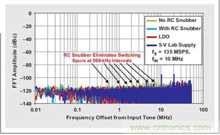 5 個實驗的 FFT 曲線圖對比(請參見圖 6)顯示噪聲底限或雜散振幅沒有出現 較大的增加。使用 LDO 清除開關噪聲使得輸出頻譜看起來幾乎與干凈 5-V 實 驗室電源完全一樣。去除 LDO 以后,我們觀測到從開關穩壓器產生了兩個雜散, 其具有一個來自 10-MHz 輸入音調的約 500 kHz 頻率偏置。RC 緩沖器電路降 低這些雜散振幅 約 3dB,從約 –108 dBc 降到了約 –111 dBc。這一值低于 ADS5483 的平均雜散振幅,其表明 ADS5483 可以在不犧牲 SNR 或 SFDR 性 能的情況下直接由一個開關穩壓器來驅動。