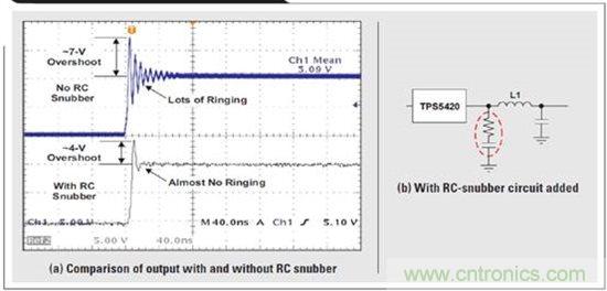 RC 緩沖器 降壓穩壓器輸出能夠以相當高的開關速度對非常大的電壓實施開關操作。本文 中,將 TPS5420 的輸入電壓軌設定為 10V,我們可以在輸出端觀測到許多過沖 和振鈴,如圖 7a 所示。為了吸收一些電源電路電抗能量,我們將 RC 緩沖電 路添加到了 TPS5420 的輸出(請參見圖 7b)。