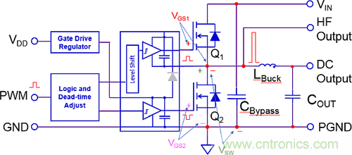 為了闡述各類GaN功率器件的測量技術(shù)和要求,我們采用如下的EPC公司的氮化鎵場效應(yīng)晶體管(eGaN FET):(i)高速、10MHz開關(guān)頻率、基于65V eGaN FET 的EPC8009半橋開發(fā)板(圖1的Q1和Q2 );以及(ii)低速、500kHz開關(guān)頻率的EPC9080半橋演示板,該演示板使用100V eGaN FET EPC2045作為頂部開關(guān)(Q1)和100V EPC2022作為底部開關(guān)(Q2)器件。如圖1所示,兩個電路板均被配置為降壓轉(zhuǎn)換器。