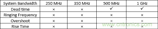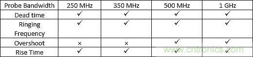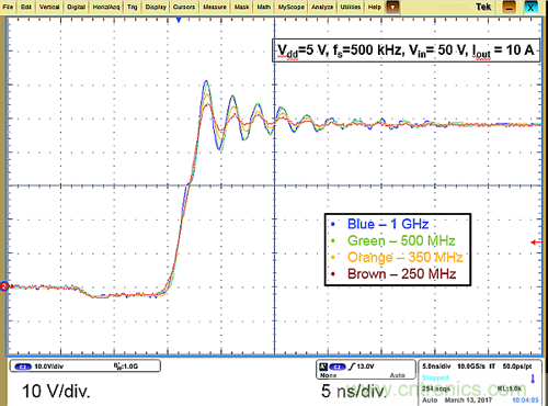 采用EPC8009的設(shè)計所測量到的振鈴頻率(fr1)為1.176GHz,它采用最高帶寬1GHz的探頭。圖2(頂部)中顯示的較低帶寬情況進(jìn)一步降低了測量振鈴頻率的準(zhǔn)確性。當(dāng)考慮峰值電壓過沖時,同樣很明顯的是,較低帶寬測量值會低估各個開關(guān)器件的峰值電壓。對于與時序相關(guān)的死區(qū)時間的測量,系統(tǒng)帶寬也很重要。如圖2(頂部)所示,對于500MHz和1GHz帶寬,死區(qū)時間是可見的,雖然測量來并不是很精確。在較低帶寬下,死區(qū)時間幾乎不存在。表1顯示了采用最高速的EPC8009,系統(tǒng)帶寬對關(guān)鍵測量結(jié)果的影響。