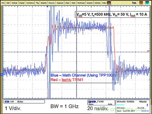 圖5顯示了對EPC9080板的高側(cè)柵-源極信號(VGS1)進(jìn)行的示波器數(shù)學(xué)技術(shù)和隔離測量系統(tǒng)之間的測量結(jié)果的差異(圖1)。