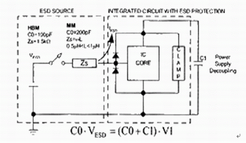 E=1/2C0×V2和E=1/2L×I2 - 如果ESD電流主要流入電源去耦電容,施加到IC的電壓由固定電荷量決定: