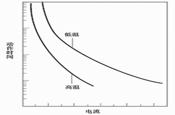 高分子PTC熱敏電阻是一種直熱式、階躍型熱敏電阻,其電阻變化過程與自身的發熱和散熱情況有關,因而其維持電流(Ihold)、動作電流(Itrip)及動作時間受環境溫度影響。圖4為熱敏電阻典型的維持電流、動作電流與環境溫度的關系示意圖。當環境溫度和電流處于A區時,熱敏電阻發熱功率大于散熱功率而會動作;當環境溫度和電流處于B區時發熱功率小于散熱功率,熱敏電阻將長期處于不動作狀態;當環境溫度和電流處于C區時,熱敏電阻的散熱功率與發熱功率接近,因而可能動作也可能不動作。圖5為熱敏電阻的動作時間與電流及環境溫度的關系示意圖。熱敏電阻在環境溫度相同時,動作時間隨著電流的增加而急劇縮短;熱敏電阻在環境溫度相對較高時具有更短的動作時間和較小的維持電流及動作電流。