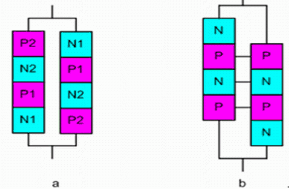 圖5 非平行的晶閘管 a) 一對(duì)非平行的晶閘管 b) 集成于單個(gè)硅器件的非平行的晶閘管