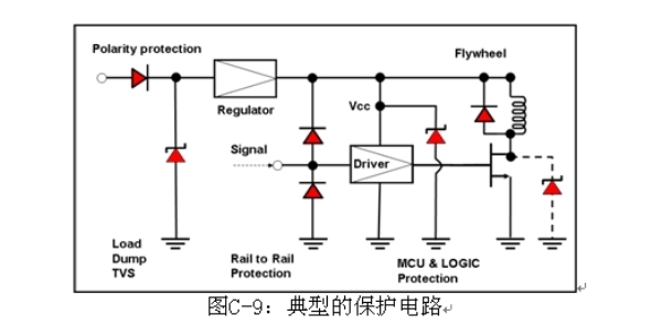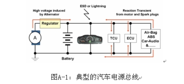 汽車電子,如電子控制單元、傳感器和娛樂系統,都是連接在一根電力線上。這些電子產品的功率來源是電池和發電機,兩者的輸出電壓都不穩定,會受到溫度、操作狀態和其他條件的影響。此外,由于這些系統使用了螺線管負載,如燃料噴射、氣門、發動機、電氣和水解控制器,ESD、尖峰噪聲和各種瞬變及浪涌電壓都會進入電源及汽車系統的信號線。