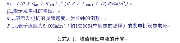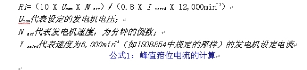 對于14 V系統的大型發電機來說,由以下ISO7637-2和ISO-8854的公式1)得出的220 A的發電機內阻為0.33 Ω,300 A型的內阻為0.24 Ω。