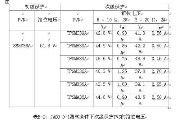 至少,兩個串聯的SM5S22A箝位負載突降電壓輸入為174 V,線路電阻為2 Ω,而SM6S22A或SM8S22A具有更低的箝位電壓和更低的線路電阻。