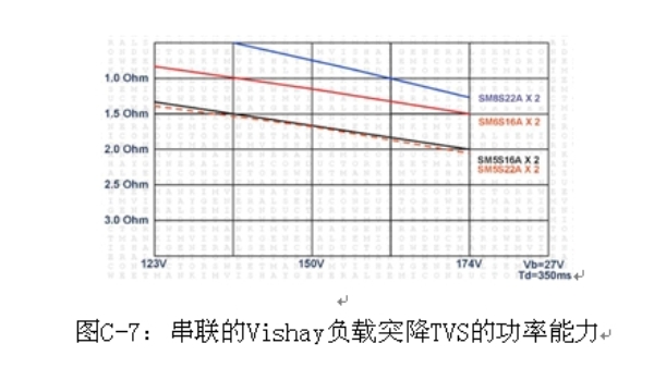 圖C-6是兩個串聯TVS的典型應用,圖C-7是各種線路電阻和電壓條件下兩個串聯的負載突降TVS的功率能力。