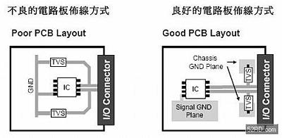 (圖一) TVS二極管的箝位效能可以透過(guò)將元件安排在接近輸出入連接點(diǎn),并將連接TVS的走線長(zhǎng)度縮短而提高。
