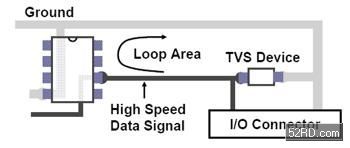 幅射噪音與受射頻信號(hào)影響的問(wèn)題可以透過(guò)盡可能縮減由高速資料與接地線所形成的迴路區(qū)大小來(lái)降低,一個(gè)解決迴路區(qū)最小化問(wèn)題的有效方法是在印刷電路板設(shè)計(jì)上加入接地面,特別是在走線長(zhǎng)度相對(duì)較長(zhǎng)時(shí),雖然將TVS元件與晶片間的距離盡量加大可以提供隔離,但卻可能增加回路區(qū)的面積大小,請(qǐng)參考(圖三)。