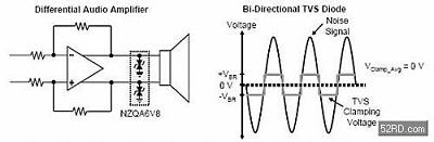 (圖五) 雙向式元件可以將噪音信號(hào)嵌位到0V的平均電壓,降低音頻放大器中的交流哼聲與直流雜音。