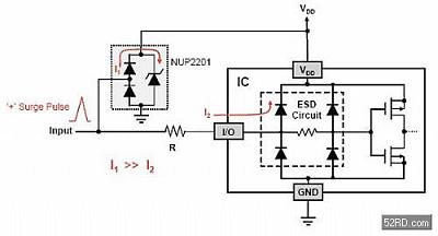 理想的外加TVS元件應(yīng)該能夠吸收所有突波脈沖的能量,但是在實(shí)際上則不然,部分的突波電流能量可能會(huì)通過(guò)晶片內(nèi)部的保護(hù)電路,一個(gè)限制電流流入內(nèi)部保護(hù)電路的方法是使用一顆串接電阻,如(圖六)。雖然內(nèi)部保護(hù)電路在避免組裝時(shí)發(fā)生ESD失效的表現(xiàn)上相當(dāng)良好,但保護(hù)元件相對(duì)較小的尺寸則限制了它們承受正常產(chǎn)品使用情狀下所發(fā)生突波信號(hào)的能力,另一方面,雖然二極管的突波處理能力與體積成正比,但通常在晶片中整合較大型的保護(hù)元件并不實(shí)際。