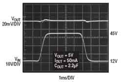 圖3LT3050針對負載突降情況的瞬態響應(AC耦合)