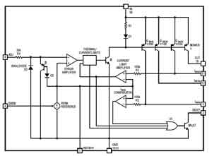 可編程短路檢測和電流限值在IMAX引腳上提供,而且該限值一旦設定,則其在整個電壓和溫度范圍內的波動幅度將小于5%。IMAX引腳是一個特別設計的電流反射鏡器件的集電極,可提供大約為輸出電流1/200的電流。該引腳同時也是精準限流放大器的輸入端。在IMAX和GND之間連接一個電阻器(RI(MAX)),用于設定短路檢測和可編程電流限制門限。限流放大器電路執行兩項功能。第一項功能是:如果IMAX引腳電壓達到600mV,則它將確定集電極開路/FAULT引腳邏輯電平。第二項功能是:它將調節輸出驅動電流以使IMAX引腳電壓不超過600mV,從而將輸出電流限制為0.6V•200/RI(MAX)。