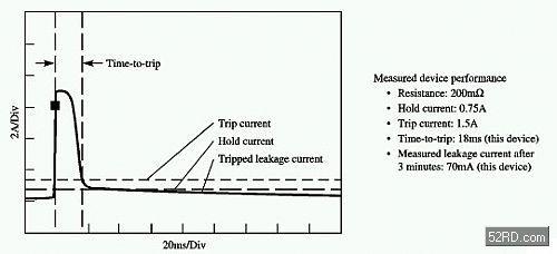 動作時間是PPTC在故障情況下對動作速度的特性所進行之描述。在小功率應用條件下,動作時間是關鍵因素,因為在整個系統的電壓降低或減弱且系統性能受到影響之前,小型電源維持在短路電流而不受損的時間可能很短。動作時間數值與元件的設計、元件的大小和工作電流性能有很大關系,且還要考慮到電路板設計;即電路板上較寬的連線或較大的焊接器等同于散熱器,均可增加動作時間。縮小焊接器的尺寸,選擇較低的工作電流能夠改善動作時間性能。