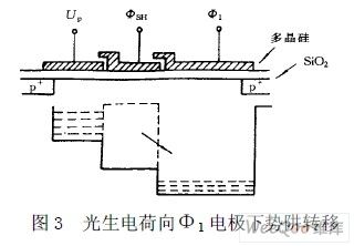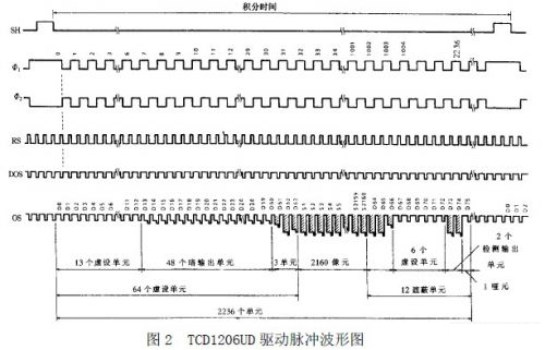 (1)工作原理。 TCD1206UD 在圖2 所示的驅動脈沖作用下工作。當ΦSH 脈沖的高電平到來時,正值Φ1 電極下均形成深勢阱,同時ΦSH 的高電平使Φ1 電極下的深勢阱與MOS 電容存儲勢阱溝通。