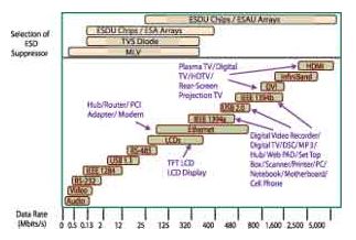 對于數(shù)據(jù)速率在350Mb/s或低于350Mb/s的應用,瞬態(tài)抑制二極管和多層壓敏電阻是提供保護的極好選擇。這些應用包括標清LCD顯示器、TFT顯示器,以及大多數(shù)的計算機周邊接口及連接。這些信號天生就允許高的插入損耗、高鉗位電壓和觸發(fā)電壓。鑒于電源引腳上并沒有任何信號,因此,高速抑制相應并不是必需的。瞬態(tài)抑制二極管和多層壓敏電阻也可以有效地保護像USB 2.0以及其他更高速率的接口電源引腳。但是,對于像DVI、HDMI、USB 3.0以及最新的IEEE 1394 A和B標準下的數(shù)據(jù)通信線路,實現(xiàn)最小信號失真的高速抑制響應對于系統(tǒng)性能和電路保護是至關重要的。這些應用包括數(shù)字視頻設備、MP3播放器、手機、 PDA、網(wǎng)絡交換器、有線和衛(wèi)星電視機頂盒、打印機、掃描儀、復印機以及筆記本電腦和上網(wǎng)本等計算機設備。