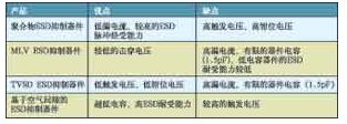 表 1給出了在靜電放電抑制器件中常用的幾種核心技術(shù)的優(yōu)點和缺點對比。聚合物靜電放電抑制器件在各種技術(shù)中可提供最低的漏電流,可承受非常高的靜電放電電壓脈沖,但在多次靜電放電事件后器件會開始降級。除此之外,該類器件相對高的觸發(fā)電壓和鉗位電壓(比空氣間隙放電產(chǎn)品高出50~100倍)則意味著更多的靜電放電脈沖能量可以通過被保護的電路。