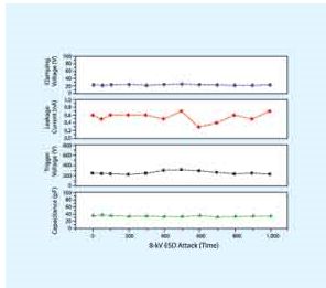 多年以來,在多種電器設備中廣泛應用多層壓敏電阻來提供有效的靜電放電抑制。多層壓敏電阻相對較低的擊穿電壓和觸發(fā)電壓以及能經(jīng)受多次脈沖的能力是相當令人滿意的。可是,多層壓敏電阻具有較高的漏電流和電容,并且降低電容帶來的有害影響導致其無法勝任高速數(shù)據(jù)的應用。[page]