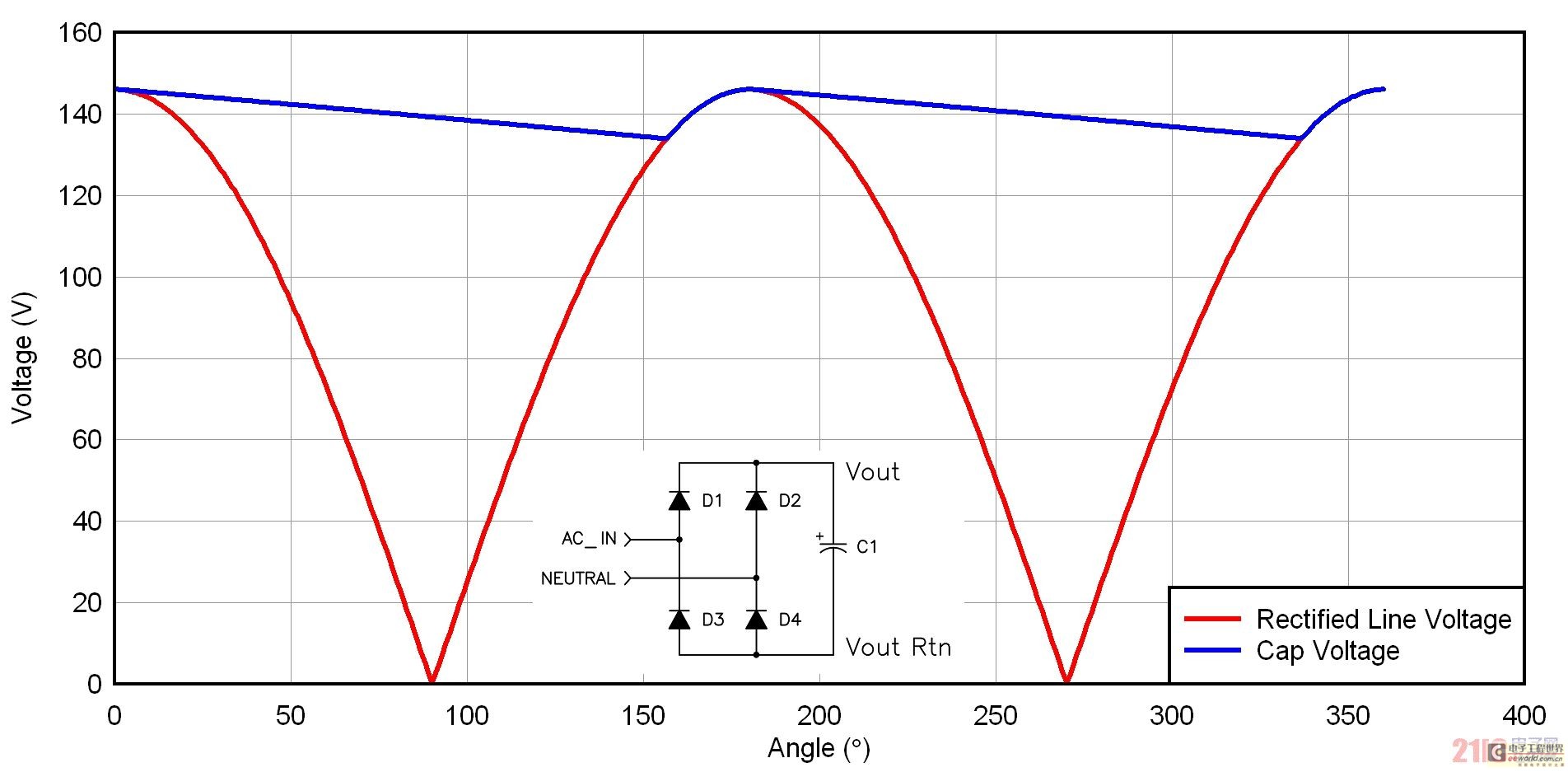 圖 1 和圖 2 顯示了離線(xiàn)電源中使用的兩種整流器配置結(jié)構(gòu)。圖 1 為一個(gè)全波橋接,其中,AC 輸入電壓經(jīng)過(guò)簡(jiǎn)單整流以后便被送至電容。這種電路常見(jiàn)于寬范圍 AC 和 230 伏 AC 應(yīng)用中。電容充電至正弦波峰值,然后在大部分半周期放電。電容紋波電流包括兩個(gè)部分:首先是充電周期,其電流由電容值和所應(yīng)用的 dV/dt 決定;其次是電容放電。電源起到恒定電源負(fù)載的作用,因此電容以非線(xiàn)性速率實(shí)施放電,其計(jì)算方法為:W = ½ * C *V^2 = P * dt。
