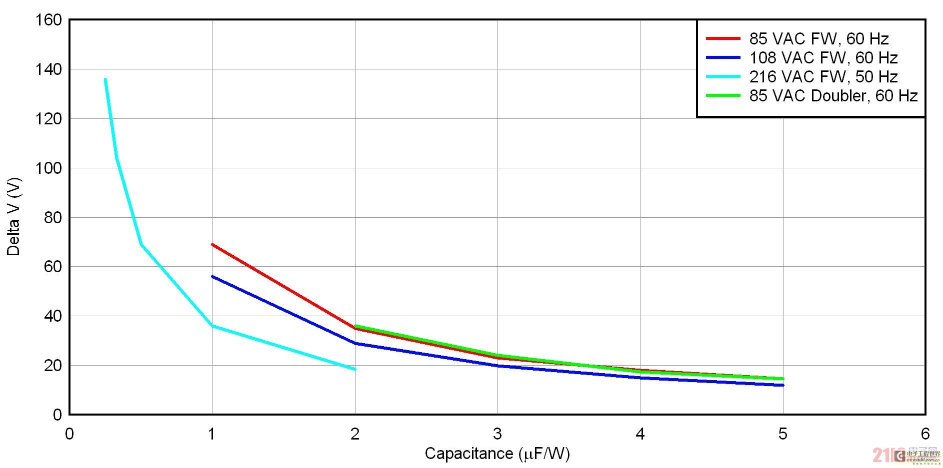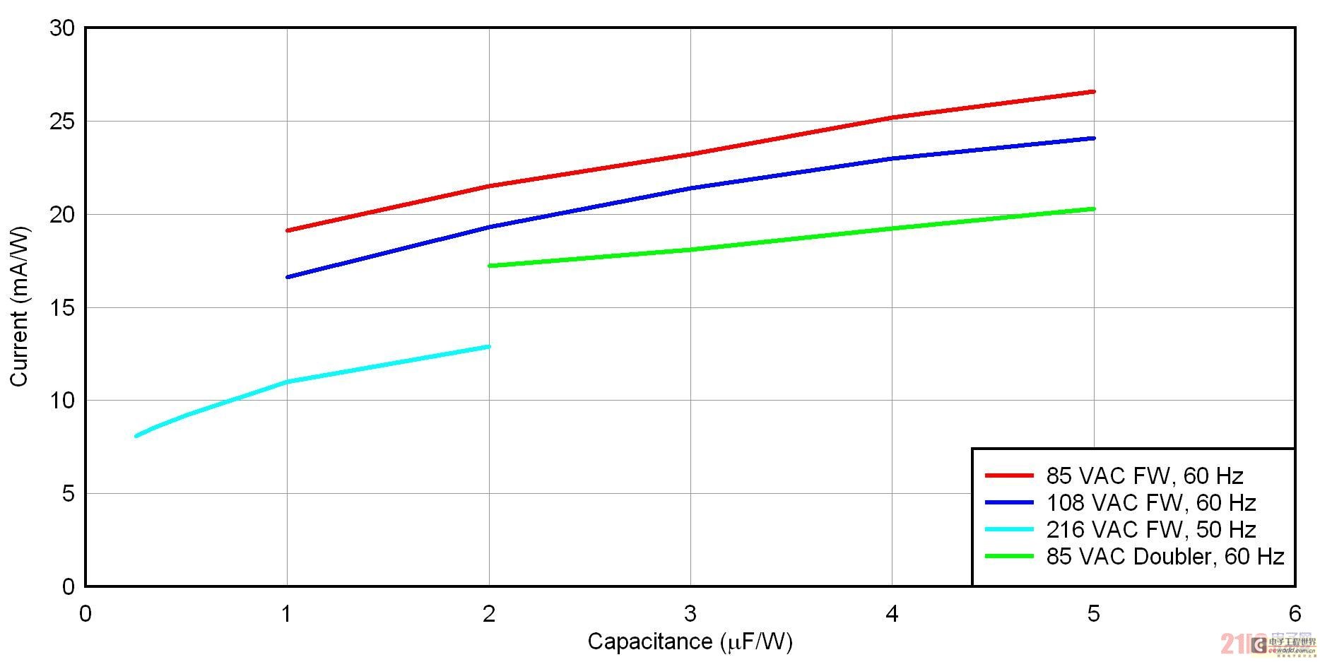 圖 3 顯示了四種整流器/輸入電壓方法的 uF/W 標(biāo)準(zhǔn)化壓降。共有三種全波橋接方法,適用于低線(xiàn)壓美國(guó)(108 VAC/60 Hz)、低線(xiàn)壓日本(85 VAC/50 Hz)和低線(xiàn)壓歐洲(216 VAC/50 Hz)。另外,還有一個(gè)低線(xiàn)壓日本的倍壓器。就全波橋而言,標(biāo)準(zhǔn)化過(guò)程只需將電容除以功率。在倍壓器中,標(biāo)準(zhǔn)化方法是將兩個(gè)串聯(lián)電容之一的電容除以功率。要想使用該曲線(xiàn)圖,請(qǐng)首先確定您的整流器配置結(jié)構(gòu),并選擇一個(gè)可以接受的壓降。之后,您只需讀取輸入電容的 uF/W 便可。最后,通過(guò)乘以您的功率,便可去標(biāo)準(zhǔn)化。