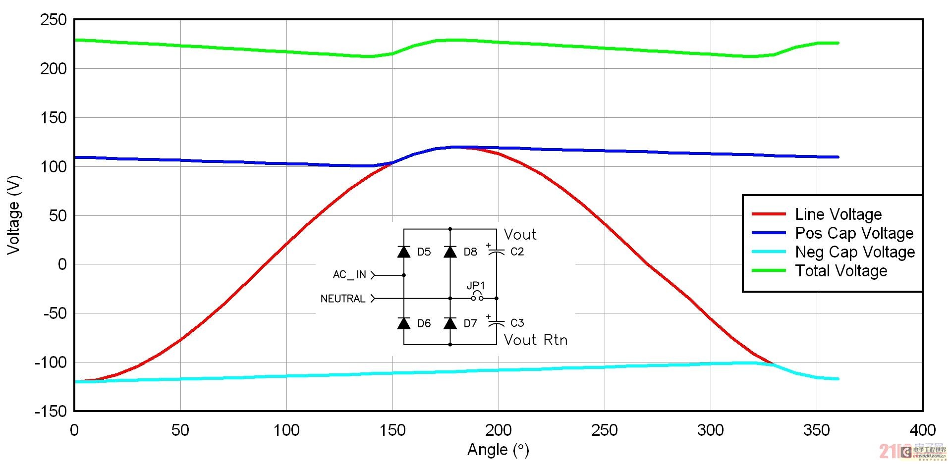 圖 2 描述了一種倍壓器整流配置結(jié)構(gòu),許多 115/230 VAC 應(yīng)用都使用了這種結(jié)構(gòu)。如果您有一個(gè) 230 VAC 應(yīng)用,則您的輸入級(jí)需要處理最大輸入電壓(265 VAC)乘以峰值因數(shù)這么大的電壓,其接近 400 伏。在與一個(gè) 115 VAC 輸入一起使用時(shí),倍壓器將經(jīng)過(guò)整流的電壓,增壓至接近 230 VAC 輸入電平。我們可以專(zhuān)為 230 VAC 線(xiàn)壓設(shè)計(jì)一個(gè)電源,以此來(lái)減小電源工作的整流后電壓范圍。我們通常使用一個(gè)跳線(xiàn)或者開(kāi)關(guān),來(lái)實(shí)現(xiàn)不同整流器配置之間的切換。這種方法的唯一缺點(diǎn)是偶爾出現(xiàn)人為倍增 230 VAC 輸入的情況,從而對(duì)電源造成嚴(yán)重破壞。圖 2 顯示了倍壓器電路的一些波形。電容之間不帶電。兩個(gè)整流器交替對(duì)每個(gè)電容施加輸入電壓。一個(gè)周期中,每個(gè)電容都被充電至峰值線(xiàn)壓,這樣它們每個(gè)都有一個(gè)線(xiàn)頻率紋波部分。由于電容為異相位充電,因此其和的紋波頻率為線(xiàn)頻率的兩倍。