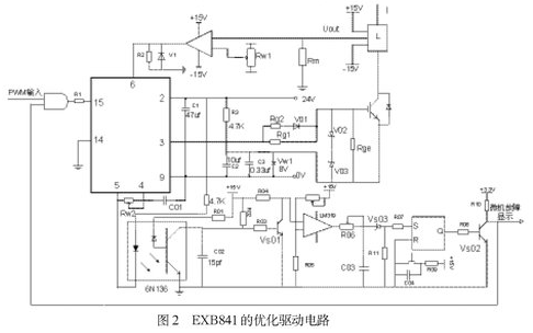 如圖2所示,用外接8V穩(wěn)壓管Vw1代替驅(qū)動(dòng)芯片內(nèi)部的穩(wěn)壓管Vz2,在穩(wěn)壓管兩端并聯(lián)了兩個(gè)電容值分別為105μf和0.33μf的去耦濾波電容。為防止柵極驅(qū)動(dòng)電路出現(xiàn)高壓尖峰,在柵射極間并聯(lián)了反向串聯(lián)的16V(V02)和8V(V03)穩(wěn)壓二極管。為了改善控制脈沖的前后沿陡度和防止震蕩,減小IGBT 集電極的電壓尖脈沖,需要在柵極串聯(lián)電阻Rg。柵極串連電阻Rg要恰當(dāng),Rg過小,關(guān)斷時(shí)間過短,關(guān)斷時(shí)產(chǎn)生的集電極尖峰電壓過高;Rg過大,器件的開關(guān)速度降低,開關(guān)損耗增大。優(yōu)化電路采用了不對(duì)稱的開啟和關(guān)斷方法。在IGBT開通時(shí),EXB841的3腳提供+16V的電壓,電阻Rg2經(jīng)二極管Vd1和Rg1并聯(lián)使Rg值較小。關(guān)斷時(shí),EXB841內(nèi)部的V5導(dǎo)通,3腳電平為0,優(yōu)化驅(qū)動(dòng)電路在IGBT的E極提供-8V電壓,使二極管V01截止,Rg= Rg1具有較大值。并在柵射極間并聯(lián)大電阻,防止器件誤導(dǎo)通。