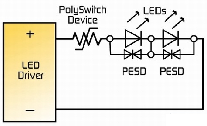 電源線耦合電壓瞬變和浪涌也可以降低LED的預期使用壽命,許多的LED驅動器容易受到不合適的DC電壓水平和極性的破壞。LED驅動器的輸出也可能被短路破壞或者摧毀。大多數LCD電視應用的LED驅動器包括內置安全裝置,包括熱關閉以及開路、短路LCD檢測。然而,可能還需要另外的過流保護元件以幫助保護集成電路(IC)以及其它敏感的電子元件。PolySwitch元件也可以被用來幫助防止當監測器的冷卻口被堵塞時可能發生的熱失控情況。由于其具有對溫度過高的情況有檢測和反應的能力,一個安裝合適的PolySwitch元件可以在LCD沒有足夠電壓運行的情況下中斷電流?! ?br />