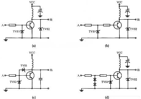 各種瞬變電壓能使晶體管的EB結(jié)或CE結(jié)擊穿而損壞,特別是晶體管集電極有感性(線圈、變壓器、電動機(jī))負(fù)載時,通常會產(chǎn)生高壓反電勢,因而可能使晶體管損壞。在實(shí)際應(yīng)用中,建議采用TVS作為保護(hù)器件。圖3所示為TVS保護(hù)晶體管的四種電路實(shí)例。