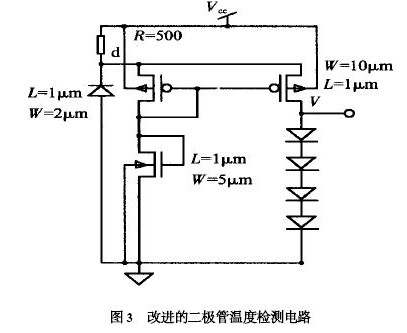假設在總電路中標準的參考電壓為2. 0 V。則二極管溫度檢測電路的參數要調節到( V T + + V T - ) / 2= 2. 0 V。調節的方法很多,3 個用作鏡像電流源的MOS管的尺寸可以很方便的調節,MOS 管尺寸改變則流過二極管的電流就會改變,從而引起上下跳變點電壓的改變。甚至還可以調節二極管,比如去掉1 個二極管,就用3 個二極管來做溫度檢測。如圖3 所示的尺寸時,50 ℃時為2. 16 V ,120 ℃時為1. 535 V ,即V T + = 1. 535 V , V T - = 2. 16 V。則( V T + + V T - ) / 2= 1. 85 V ,不到2. 0 V。最方便的調節方法就是放大二極管前面1 個NMOS 管的尺寸。尺寸越大則跳變點電壓就越高。當然也可以調節另外的2 個MOS 管的尺寸??傊沟? V T + + V T - ) / 2 = 2. 0 V?! ?br />