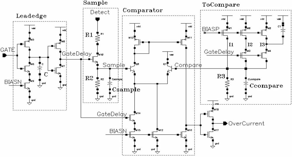 當(dāng)LDMOS 的柵電壓V (GATE) 為高,即LDMOS 管導(dǎo)通時,使圖3 中的采樣開關(guān)管M10(具有較高耐壓和較低導(dǎo)通電阻特性)也導(dǎo)通,同時開始采集LDMOS 管的飽和漏極電壓;而當(dāng)LDMOS 管的柵電壓V(GATE)為低,即LDMOS 管關(guān)閉時(非過流現(xiàn)象),采樣電路則不工作。