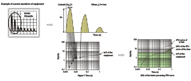 由于開(kāi)關(guān)電源的出現(xiàn),使得線路中的浪涌電流變得復(fù)雜,多變,不同的浪涌電流或工作電流波形產(chǎn)生的能量是不同的,電路設(shè)計(jì)者要了解回路中出現(xiàn)的浪涌電流或工作電流的波形,以適當(dāng)?shù)剡x擇熔斷的工作電流。參照?qǐng)D (3)