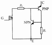 2)超出關斷安全工作區引起擎住效應而損壞擎住效應分靜態擎住效應和動態擎住效應。IGBT為PNPN4層結構,其等效電路如圖1所示。體內存在一個寄生晶閘管,在NPN晶體管的基極與發射極之間并有一個體區擴展電阻Rs,P型體內的橫向空穴電流在Rs上會產生一定的電壓降,對NPN基極來說,相當于一個正向偏置電壓。在規定的集電極電流范圍內,這個正偏置電壓不大,對NPN晶體管不起任何作用。當集電極電流增大到一定程度時,該正向電壓足以使NPN晶體管開通,進而使NPN和PNP晶體管處于飽和狀態。于是,寄生晶閘管導通,門極失去控制作用,形成自鎖現象,這就是所謂的靜態擎住效應。IGBT發生擎住效應后,集電極電流增大,產生過高功耗,導致器件失效。動態擎住效應主要是在器件高速關斷時電流下降太快,dvCE/dt很大,引起較大位移電流,流過Rs,產生足以使NPN晶體管開通的正向偏置電壓,造成寄生晶閘管自鎖[2]。