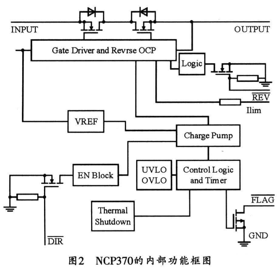 將外設(shè)連到IN端,NCP370便可進(jìn)入反向模式。此時,外設(shè)內(nèi)部的電池可由NCP370的OUT端來供電。在反向模式下,NCP370的REV端必須置低,這樣,當(dāng)外設(shè)發(fā)生過壓、欠壓或過流等故障時,NCP370內(nèi)部的過壓、欠壓或過流保護(hù)電路才會起作用,同時其FLAG也才會向系統(tǒng)發(fā)出報警信號。圖2所示是NCP370的內(nèi)部功能框圖。
