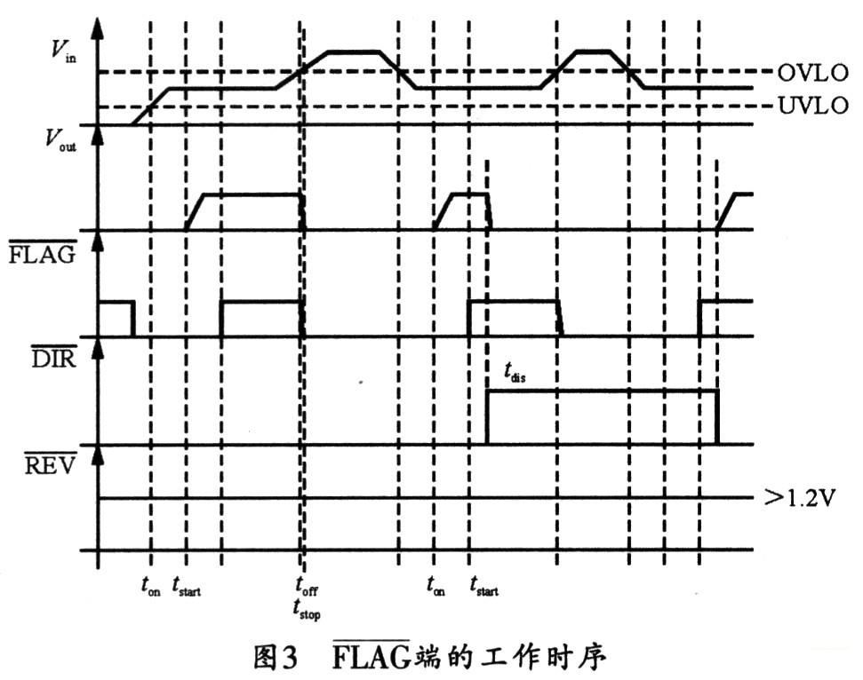 NCP370內(nèi)含一個FLAG報警提示引腳。一旦NCP370檢測到輸入電壓高于OVLO閥值、低于U-VLO閥值或過流、過壓等故障,F(xiàn)LAG端就會置低,并通知微控制器采取適當(dāng)?shù)拇胧?。而?dāng)輸入電壓恢復(fù)到正常范圍時,F(xiàn)IAG又會在經(jīng)過一個延遲后置高,隨后使Vout恢復(fù)輸出,其工作時序如圖3所示。