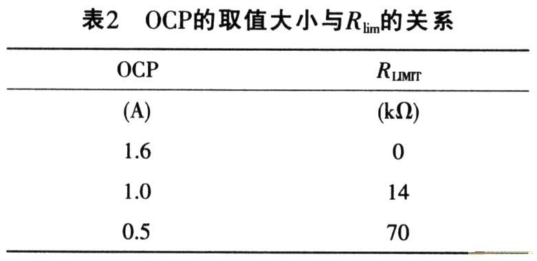 當(dāng)外設(shè)電阻Rlim上的電流(Ilim)高于Iocp時,流過其內(nèi)部N溝道MOS管的電流就會受到限制,這樣,NCP370就能提供從電池到外設(shè)的反向過流保護(hù)功能。由于NCP370的內(nèi)部電阻與Ilim是串聯(lián)關(guān)系,因此,當(dāng)Ilim引腳直接與GND相連時,其OCP最大,而在它們之間接入Rlim時,其OCP會減小,OCP的取值大小如表2所列。當(dāng)電流高于OCP時,其內(nèi)部的NMOS會關(guān)斷,且/FIAG會置低,同時NCP370會通知微控制器來對故障進(jìn)行處理,并禁止反向充電模式。